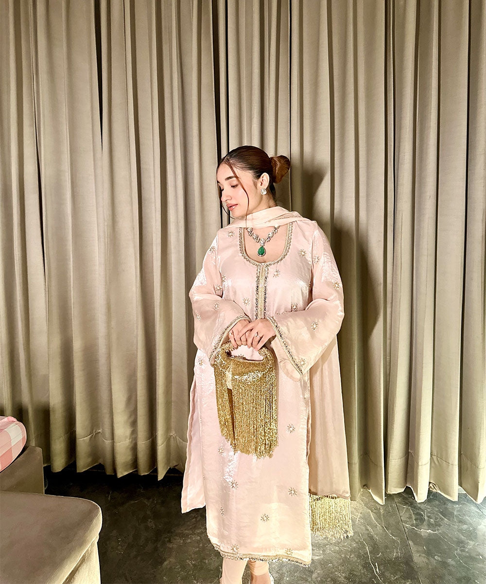 šø Kurta: Premium Imported Organza in soft blush palette, adorned with delicate hand-embroidered floral motifs and subtle gota detailing on neckline, finished with golden fringe accents on hem & sleeves, elegant straight fit knee-length design.