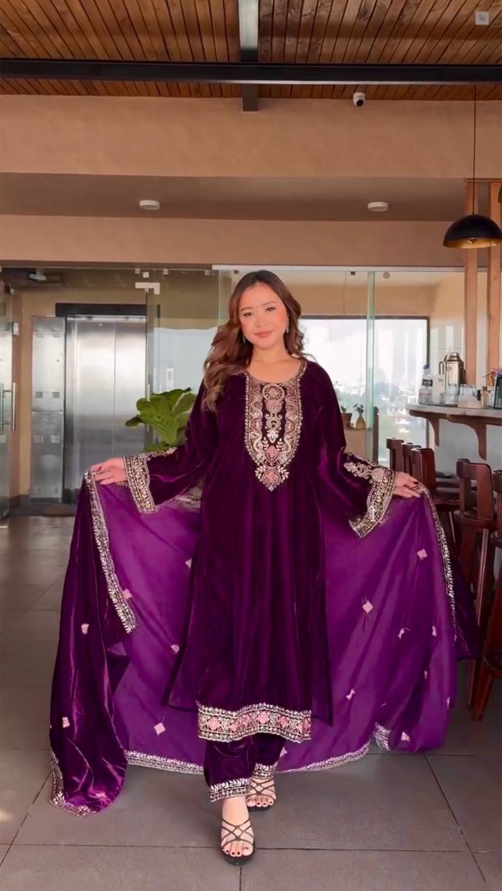 Purple Color Embroidered Pure Velvet Suit Set