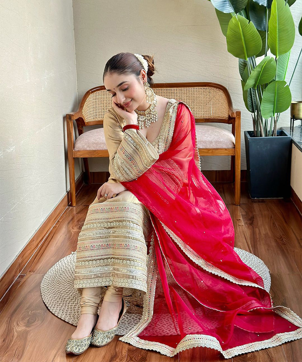 Dupatta: Contrasting red dupatta with intricate embellishments.